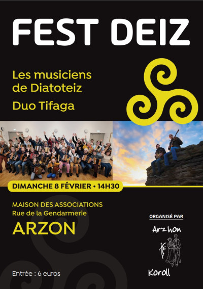 L'association Arzhon e Koroll vous propose de venir danser avec ses danseurs et danseuses, accompagnés par les musiciens du groupe DIATOTEIZ et du groupe DUO TIFAGA, à l'occasion du Fest-DEiz du dimanche 8 février 2026, à 14h30 à la Maison des associations d'Arzon.
